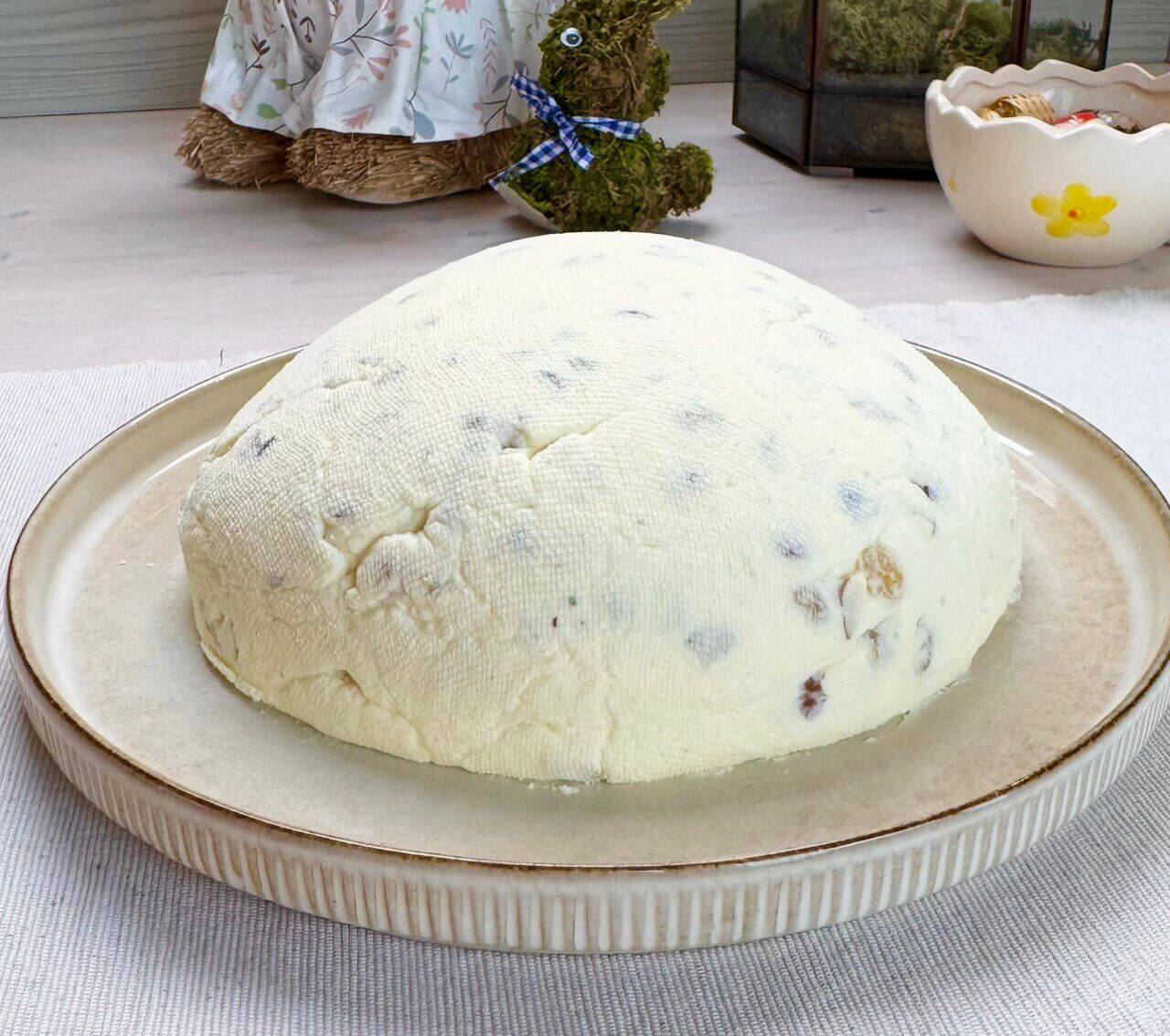 - Ryte atlenkite marlės kraštus, nuimkite plėvelę. Prispauskite serviravimo lėkštę ir apverčiant sietelį kartu su lėkšte įdėkite paschą. Atsargiai nuimkite marlę. Papuoškite mėgstamomis uogomis, riešutais ar razinomis. Skanaus!